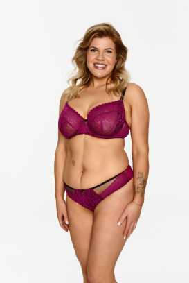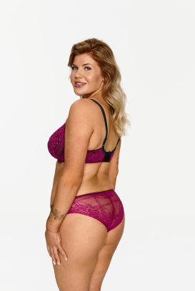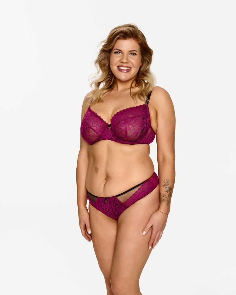 Model stworzony z myślą o kobietach o pełniejszych kształtach. Miękki biustonosz z fiszbinami zapewnia stabilne podtrzymanie nawet większego biustu, jednocześnie gwarantując wygodę i piękny wygląd. Uszyty z koronki w odcieniu ciemnego różu, uzupełniony o czarne akcenty, które dodają charakteru. Komfort i elegancja w najlepszym wydaniu.