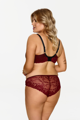 Stylowy biustonosz w kolorze bordo, zaprojektowany z myślą o kobietach z pełniejszym biustem. Wykonany z miękkiej koronki, doskonale dopasowuje się do kształtu piersi, zapewniając wygodę i stabilne podtrzymanie. Miseczki miękkie, na fiszbinach, zdobione eleganckim, kwiatowym motywem. Konstrukcja gwarantuje idealne podtrzymanie nawet w większych rozmiarach. Mostek ozdobiony subtelną zawieszką w kolorze złota. Ramiączka szersze, regulowane, nieodpinane. Biustonosz łączy funkcjonalność z kobiecym stylem.