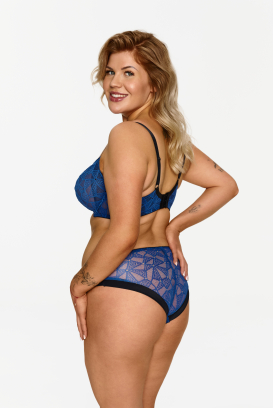 Model stworzony z myślą o pełniejszych kształtach. Miękki biustonosz z fiszbinami zapewnia stabilne podtrzymanie nawet większego biustu, jednocześnie gwarantując wygodę i piękny wygląd. Wykonany z miękkiego plenu w odcieniu głębokiego błękitu, uzupełniony o czarne akcenty, które dodają charakteru. Komfort i elegancja w najlepszym wydaniu.