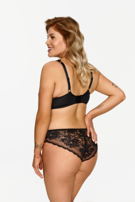 Klasyczne figi w czarnym kolorze, wykonane z koronkowej siateczki z pięknym wzorem. Komfortowy krój sprawia, że doskonale układają się na sylwetce. Skład surowcowy: Biustonosz: 85% poliamid, 15% elastan Figi: 70% poliamid, 20% elastan, 10% bawełna